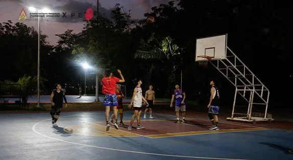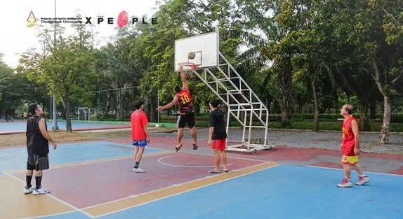 “การรู้จักผู้คนใหม่ ๆ” คือสิ่งที่จุ้ยเน้นย้ำว่าเป็นเสน่ห์ของการเล่นบาสที่ธรรมศาสตร์ เพราะที่นี่เปิดกว้างสำหรับทุกคน และบาสเกตบอลยังเป็นกีฬาที่เล่นคนเดียวไม่ได้ ต้องมีการแบ่งกลุ่มแล้วเล่นเป็นทีม วันไหนเพื่อนในกลุ่มมาไม่ครบ ก็จะเกิดการชักชวนน้อง ๆ หรือพี่ ๆ ในสนามมาเล่นด้วยกันเป็นทีม จนทุกคนในสนามต่างรู้จักกันหมด ไม่ว่าจะต่างคณะ ต่างวัย หรือต่างอาชีพ เราก็ฟอร์มทีมเล่นด้วยกันในสนามเป็น Community เดียวกันมาโดยตลอด บรรยากาศสนามโดยรอบยิม 7 จึงมีทั้งนักศึกษาแลกเปลี่ยนต่างชาติ นักเรียนมัธยม และพี่ ๆ เจ้าหน้าที่มหาลัย ที่จุ้ยและเพื่อน ๆ ของเขาแทบจะรู้จักทุกคนในสนามผ่านการเล่นบาสในทุก ๆ วัน